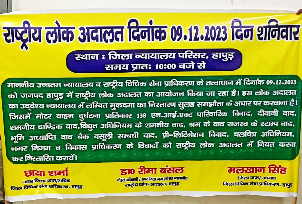 माननीय उ०प्र०राज्य विधिक सेवा प्राधिकरण, लखनऊ के पत्रांक संख्या. 3249/एसएलएलए-127/2022-एन.एल.ए (सरन) दिनांकित 09.10.2023 एवं पत्रांक सं० 3267/एसएलएसए-127/2022 (विशेष लो०अ०) दिनांकित 11.10.2023 के अनुपालन में एवं माननीय जनपद न्यायाधीश / अध्यक्ष जिला विधिक सेवा प्राधिकरण, हापुड़ की अध्यक्षता में जिला विधिक सेवा प्राधिकरण, हापुड़ द्वारा दिनांक 09.12.2023 दिन शनिवार प्रातः 10:00 बजे से जनपद न्यायालय हापुड़ में राष्ट्रीय लोक अदालत एवं दिनांक 06.12.2023, 07.12.2023 एवं 08.12.2023 को विशेष लोक अदालत का आयोजन किया जाना है।