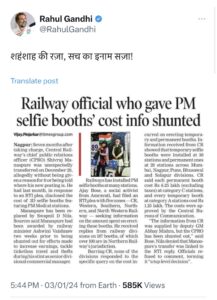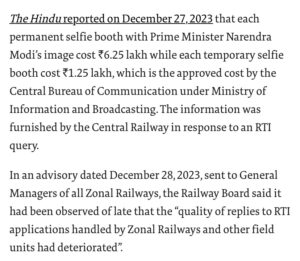 अख़बार लिखता है कि बीते साल दिसंबर 27 को छपी एक रिपोर्ट में कहा गया था कि रेलवे स्टेशन पर प्रधानमंत्री नरेंद्र मोदी की छवि वाले पर्मानेन्ट सेल्फ़ी बूथ की लागत 6.25 लाख रुपये है, जबकि इस तरह के अस्थायी बूथ की लागत 1.25 लाख रुपये है. ये सूचना प्रसारण मंत्रालय के तहत केंद्रीय संचार ब्यूरो द्वारा अनुमोदित लागत है, अख़बार के अनुसार एक आरटीआई के जबाव में ये जानकारी दी गई थी।