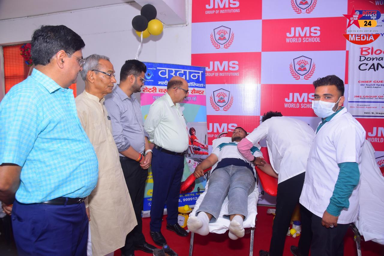 हापुड़ में स्थित JMS group of institutions Hapur के तत्वावधान में दिनांक 01-05-2024 को प्रातः 10 बजे बी. ब्लॉक के सभागार में रोटरी क्लब ऑफ़ हापुड़ सेंट्रल के द्वारा JMS group में ब्लड कैंप का आयोजन किया गया। ब्लड कैंप के आयोजन के अवसर पर संस्थान के माननीय मैनेजमेंट डॉ आयुष सिंघल, प्रबंध निदेशक एवं सचिव डॉ रोहन सिंघल ने संस्थान में पधारे हापुड़ जनपद के मुख्य चिकित्सा अधिकारी डॉ सुनील त्यागी का बतौर मुख्य अतिथि पुष्पगुच्छ देकर समान्नित किया। जनपद के CMO डॉ सुनील त्यागी जी ने संस्थान में अध्यनरत सभी छात्र छात्राओ को स्वास्थय सम्बन्धी जानकारी देते हुए नई नई टिप्स दी।