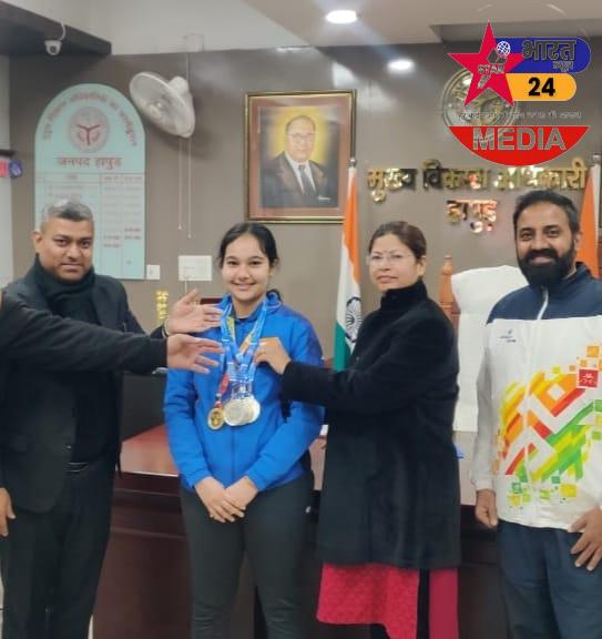 जनपद हापुड़ की इंटरनेशनल शूटर खिलाड़ी संस्कृति बाना का जिला प्रशासन हापुड़ द्वारा आज दिनांक 8 जनवरी 2025 को जोरदार स्वागत किया गया।संस्कृति बाना ने हाल ही में आयोजित 68 वी राष्ट्रीय स्कूल गेम्स ,भोपाल एवं 67 वी राष्ट्रीय शूटिंग चैंपियनशिप नई दिल्ली में आयोजित प्रतियोगिता में क्रमशः एक गोल्ड एक कांस्य तथा तीन सिल्वर मेडल प्राप्त कर जिले का नाम रोशन किया है।