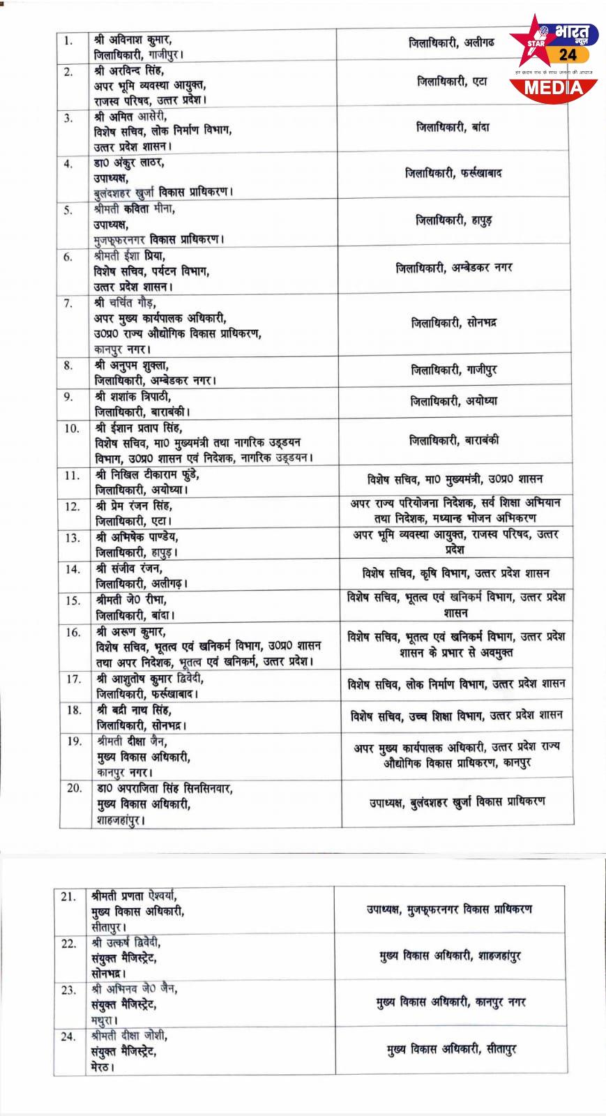 उत्तर प्रदेश सरकार ने प्रशासनिक व्यवस्था को मजबूत करने के उद्देश्य से बड़ा कदम उठाते हुए 24 आईएएस अधिकारियों के तबादले कर दिए हैं। शासन स्तर से जारी आदेश के अनुसार कई जिलों और विभागों में अधिकारियों को नई जिम्मेदारियां सौंपी गई हैं।इस फेरबदल के तहत हापुड़ जिले में भी महत्वपूर्ण बदलाव किया गया है। मुजफ्फरनगर विकास प्राधिकरण की उपाध्यक्ष कविता मीणा को हापुड़ का नया जिलाधिकारी नियुक्त किया गया है। वहीं, वर्तमान जिलाधिकारी अभिषेक पांडेय का तबादला कर उन्हें राजस्व परिषद में अपर भूमि व्यवस्था आयुक्त के पद पर तैनात किया गया है।