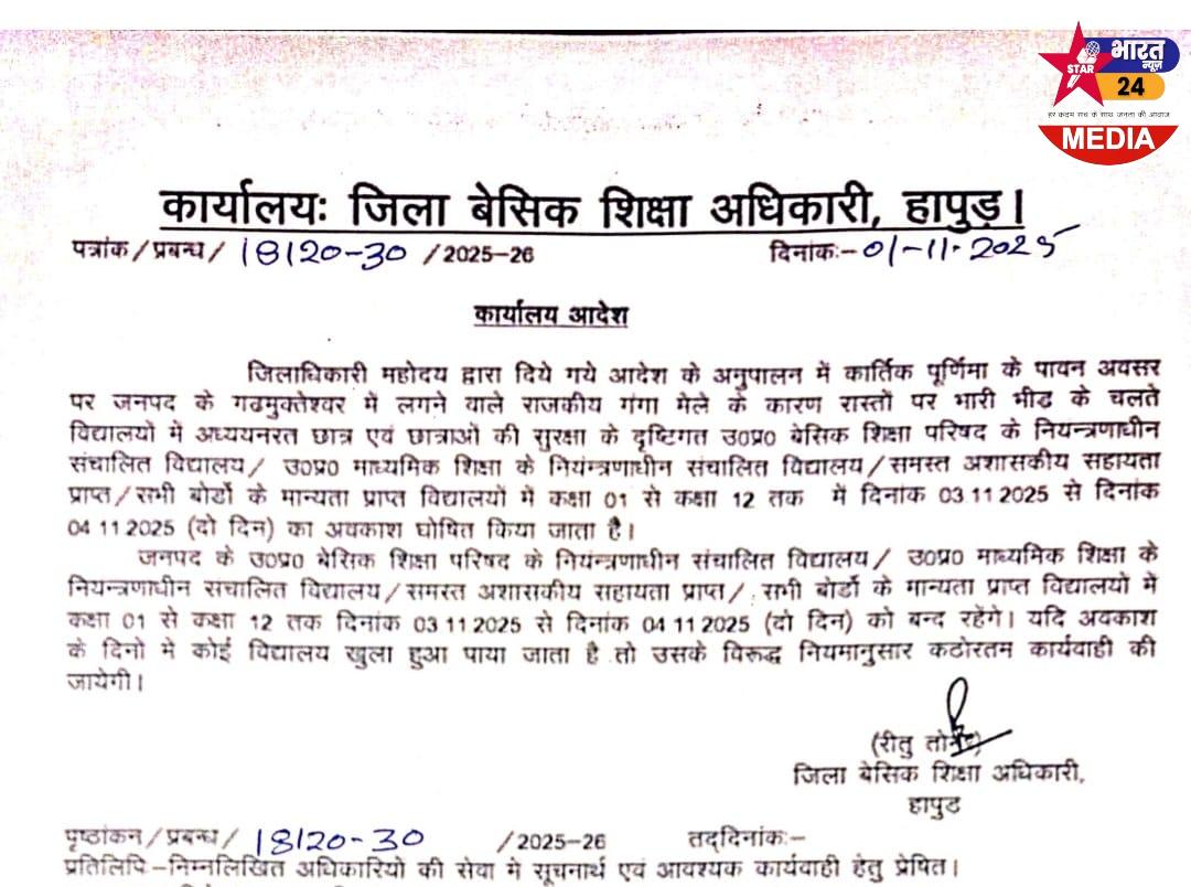 हापुड़ में गंगा मेले के चलते दो दिन बंद रहेंगे सभी स्कूल — जिला बेसिक शिक्षा अधिकारी ने जारी किया आदेश। 02/11/2025 No Comments
