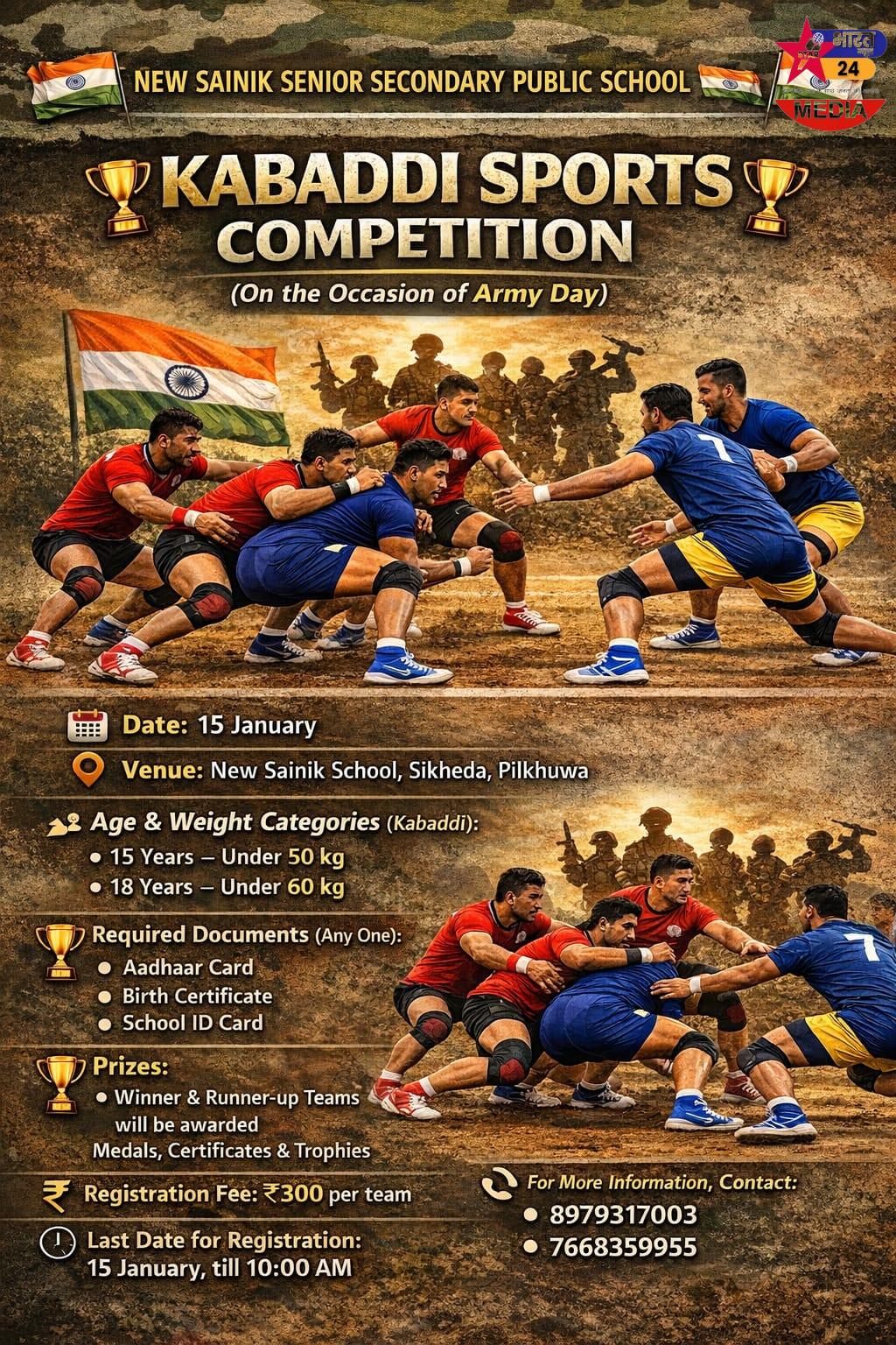 सेना दिवस पर न्यू सैनिक स्कूल में कबड्डी प्रतियोगिता का आयोजन, विद्यार्थियों को मिलेगा खेल प्रतिभा दिखाने का अवसर। 12/01/2026 No Comments